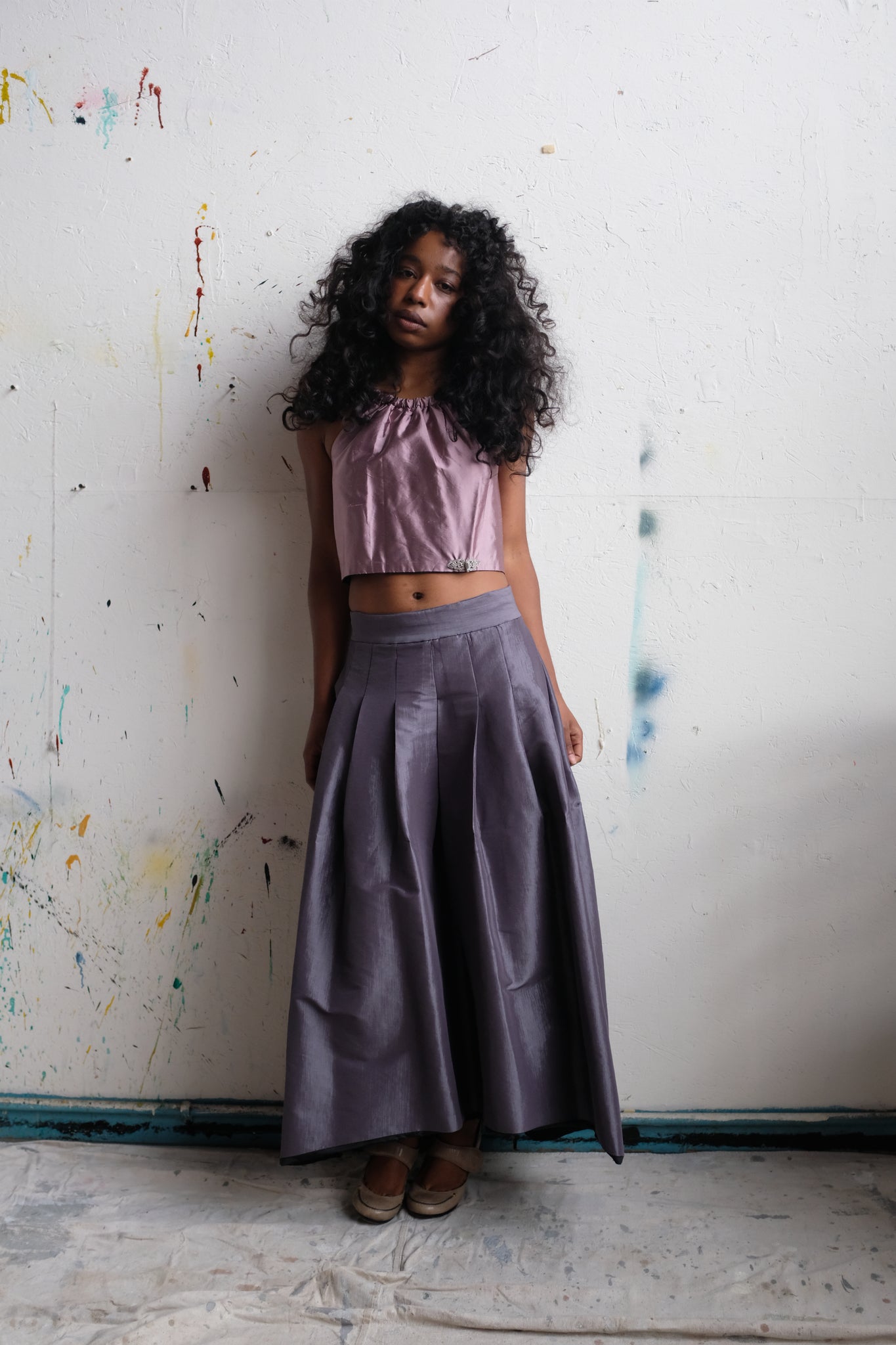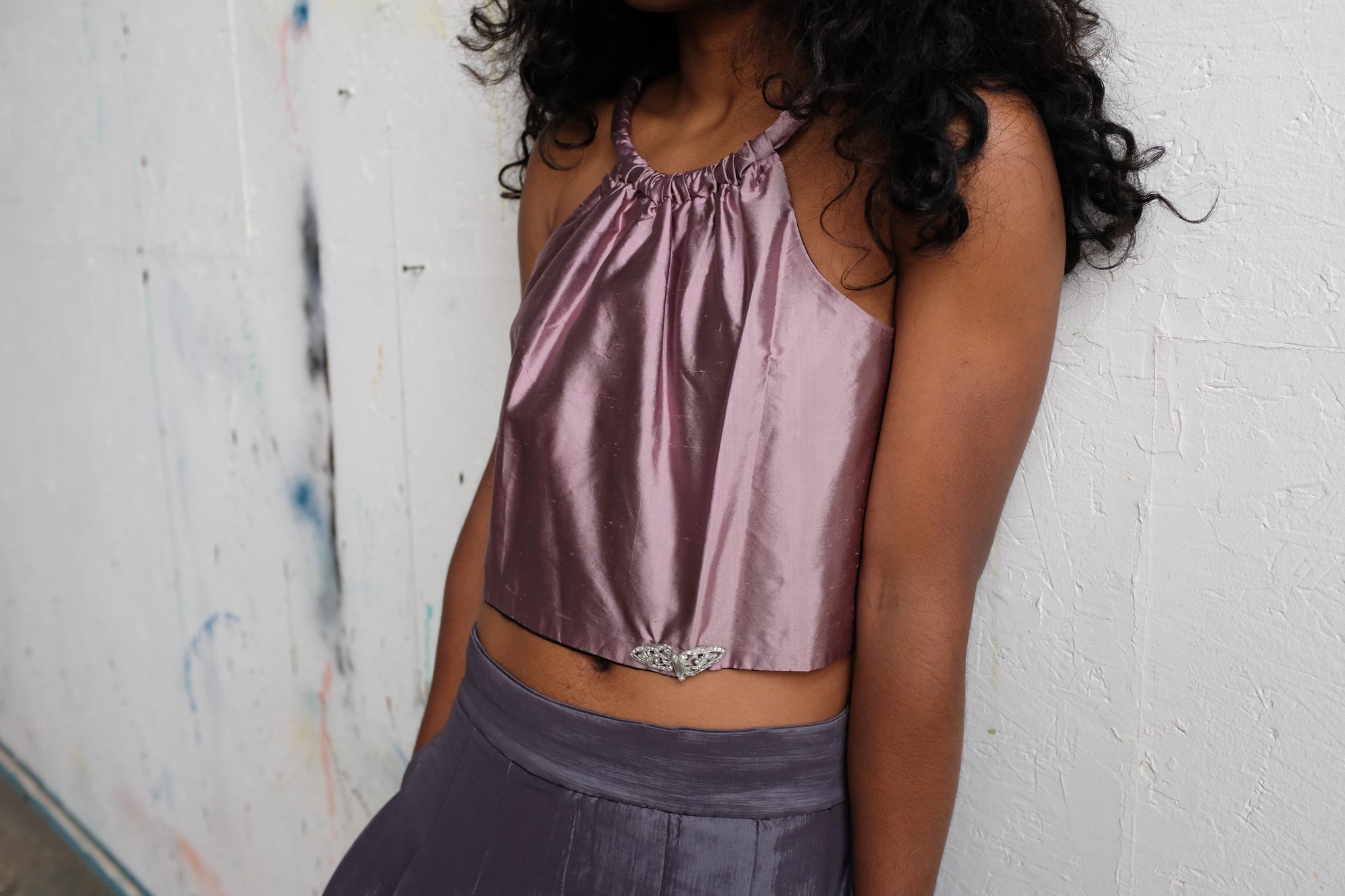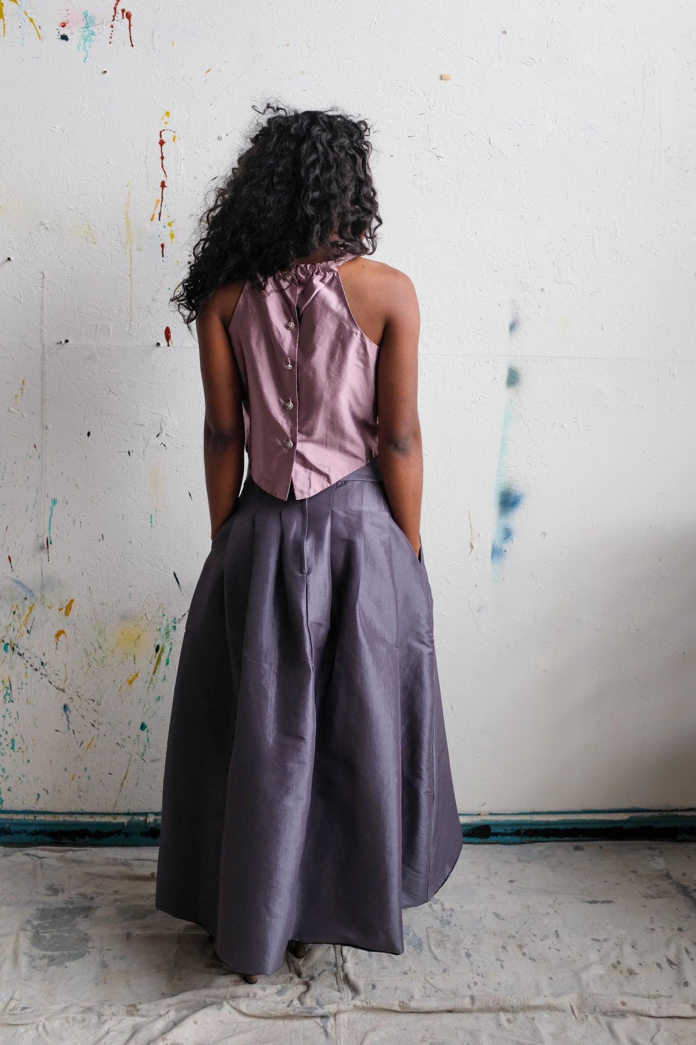 Two piece lilac and lavender skirt set. Romantic and classic. This piece is handmade by my Abuelita. Top is made of raw silk, skirt is taffeta blend, both with a black nylon lining. Vintage buttons and brooch adorn the top. Skirt has a back zip and two large pockets. Can sit high or low on the waist depending on size. Top can be styled with the buttons in front or back.