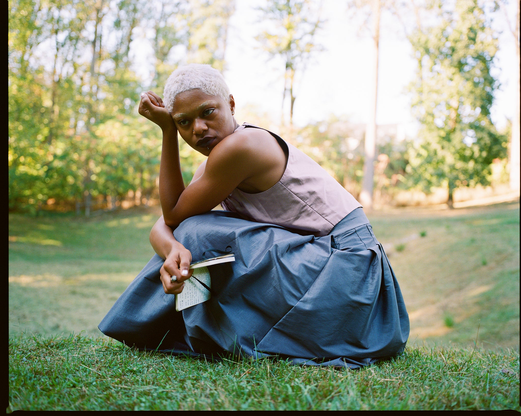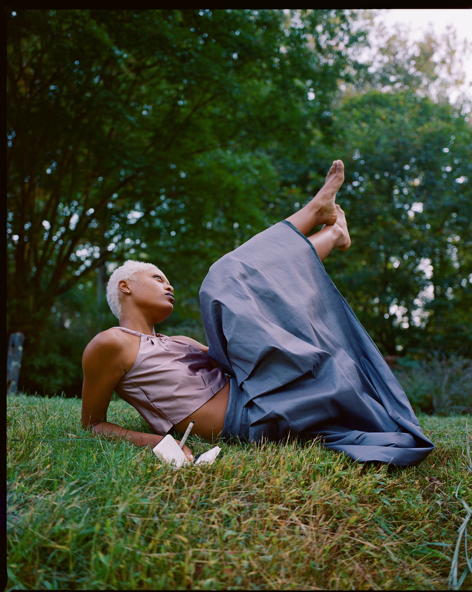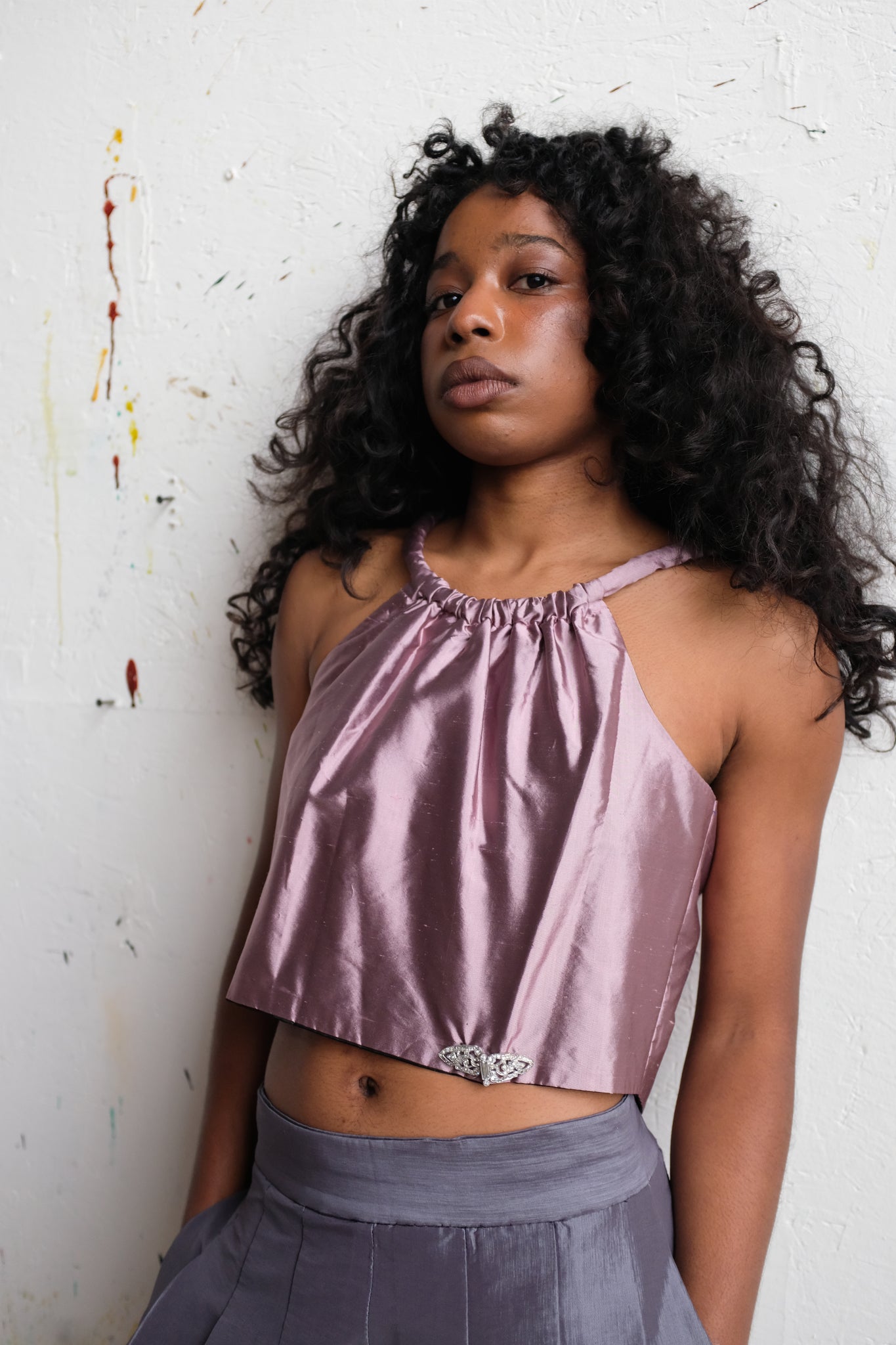 Two piece lilac and lavender skirt set. Romantic and classic. This piece is handmade by my Abuelita. Top is made of raw silk, skirt is taffeta blend, both with a black nylon lining. Vintage buttons and brooch adorn the top. Skirt has a back zip and two large pockets. Can sit high or low on the waist depending on size. Top can be styled with the buttons in front or back.